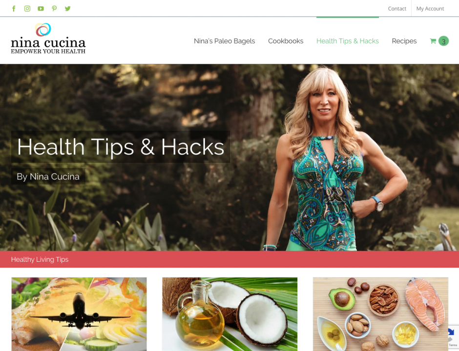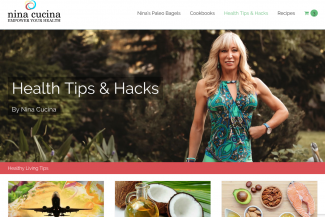 Nina’s site also features a vast assortment of her custom recipes, as well as her blog, “Health Tips & Hacks”